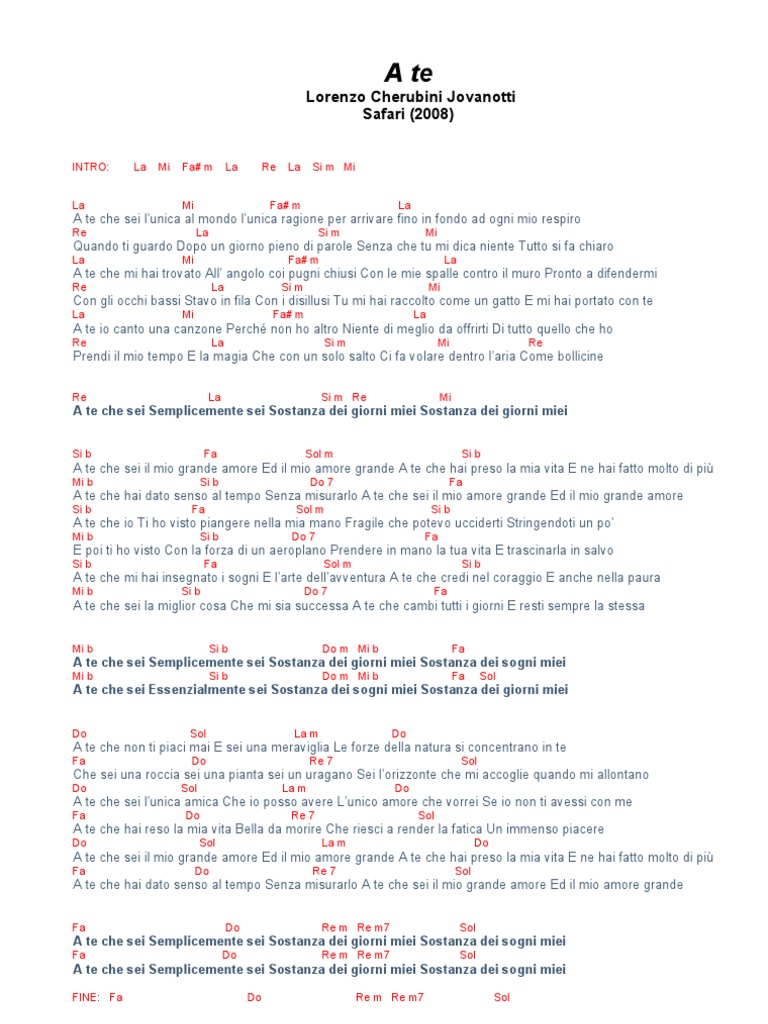 A Te Jovanotti Accordi / Accordi A Te Jovanotti : Qui trovi tutti gli spartiti e gli accordi delle canzoni di jovanotti.. Abbiamo un interessante prontuario per te che puoi trovare a questo link. Learn the song with the online tablature player. A te è la terza traccia dell'album safari di jovanotti, pubblicato nel 2008 per universal music group. Translation of 'a te' by jovanotti from italian to english. 0 ratings0% found this document useful (0 votes).
