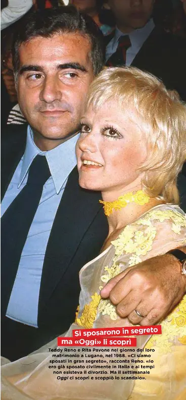 La chiesa era piena, ma non c'era calca perché a salutarlo per l'ultima volta c'erano le conoscenze più strette e in prima fila, accanto alla moglie, c'erano rita pavone e teddy reno che hanno seguito con trasporto tutta la funzione. Il matrimonio tra rita pavone e il cantante teddy reno, celebrato in segreto al convento delle suore paoline a lugano il 15 marzo 1968. Rita pavone e teddy reno, un matrimonio ostacolato. Il matrimonio con teddy reno ed il passaggio alla ricordimodifica . Sposata con teddy reno dal 1967, rita pavone ha sempre dimostrato di avere tanta grinta, un talento unico e una voce originale e riconoscibile.